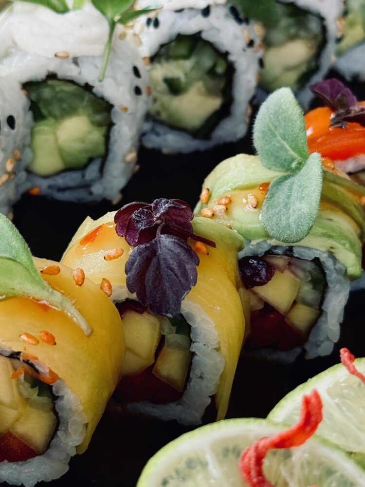 Grüner Tempura-Spargel/ Avocado/ Gurke/ Sesam/ Avocado-Topping & Avocado-Sauce