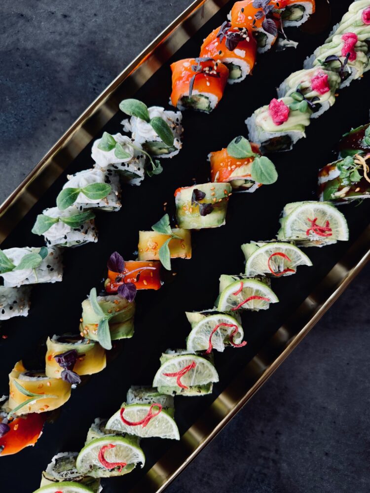 Grüner Tempura-Spargel/ Avocado/ Sesam/ Kresse/ Kimchi-Sesam/ Flambierte Paprika-Topping & Physalis-Sauce